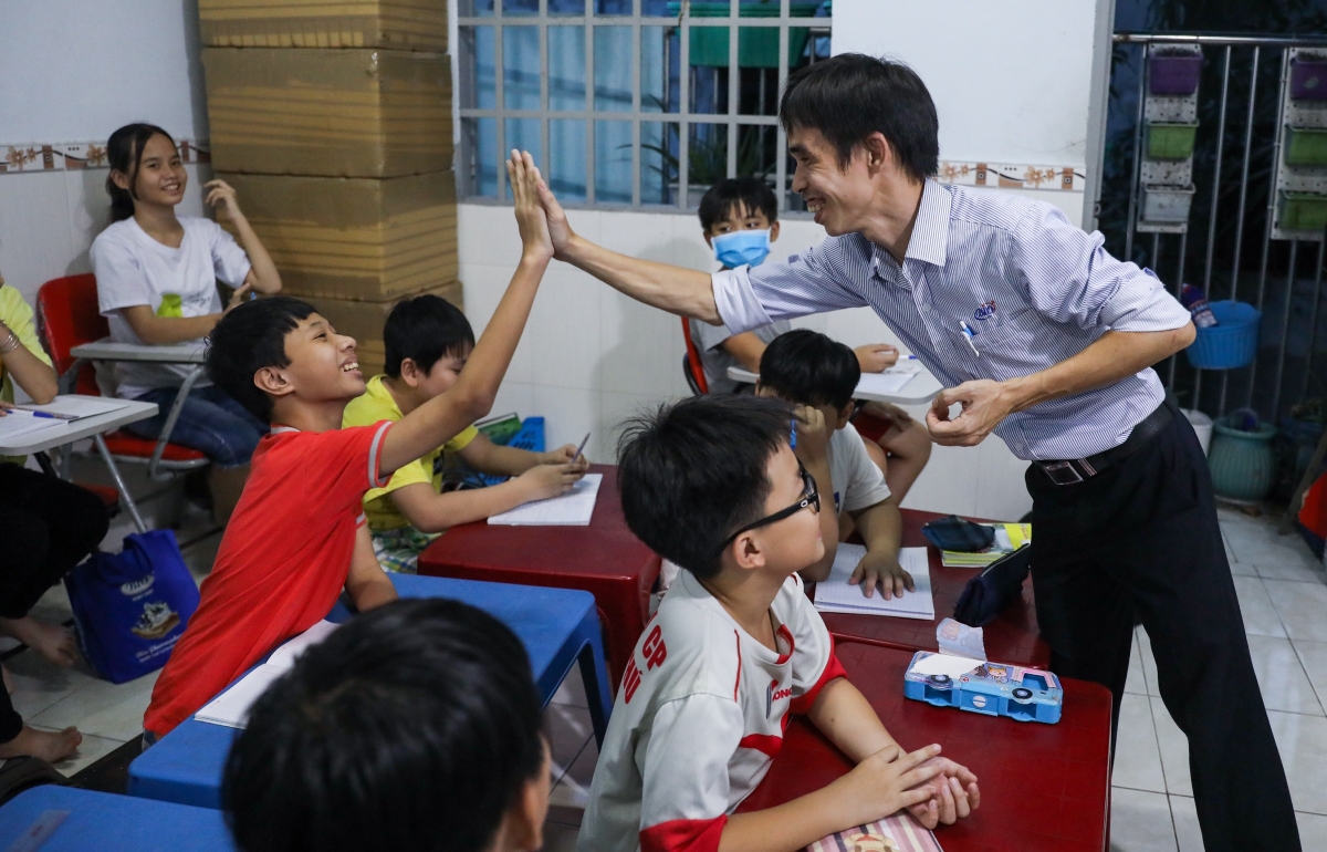 10 năm nay, lớp học miễn phí của anh Hoàng Trọng Khánh, trên đường 22 (phường Phước Long B, quận 9) luôn sáng đèn hàng ngày. Lớp nằm trên tầng lầu của phòng trọ rộng 30 m2, có khoảng 50 học sinh, chủ yếu là con công nhân từ lớp 6 đến lớp 9.